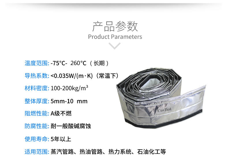 Covhot自粘式保溫帶產(chǎn)品作為方便拆卸的保溫隔熱產(chǎn)品,具有耐高溫、導熱系數(shù)低、耐酸堿、防火阻燃能力。